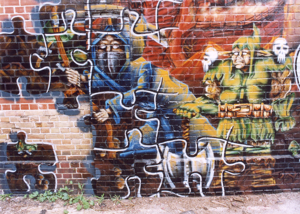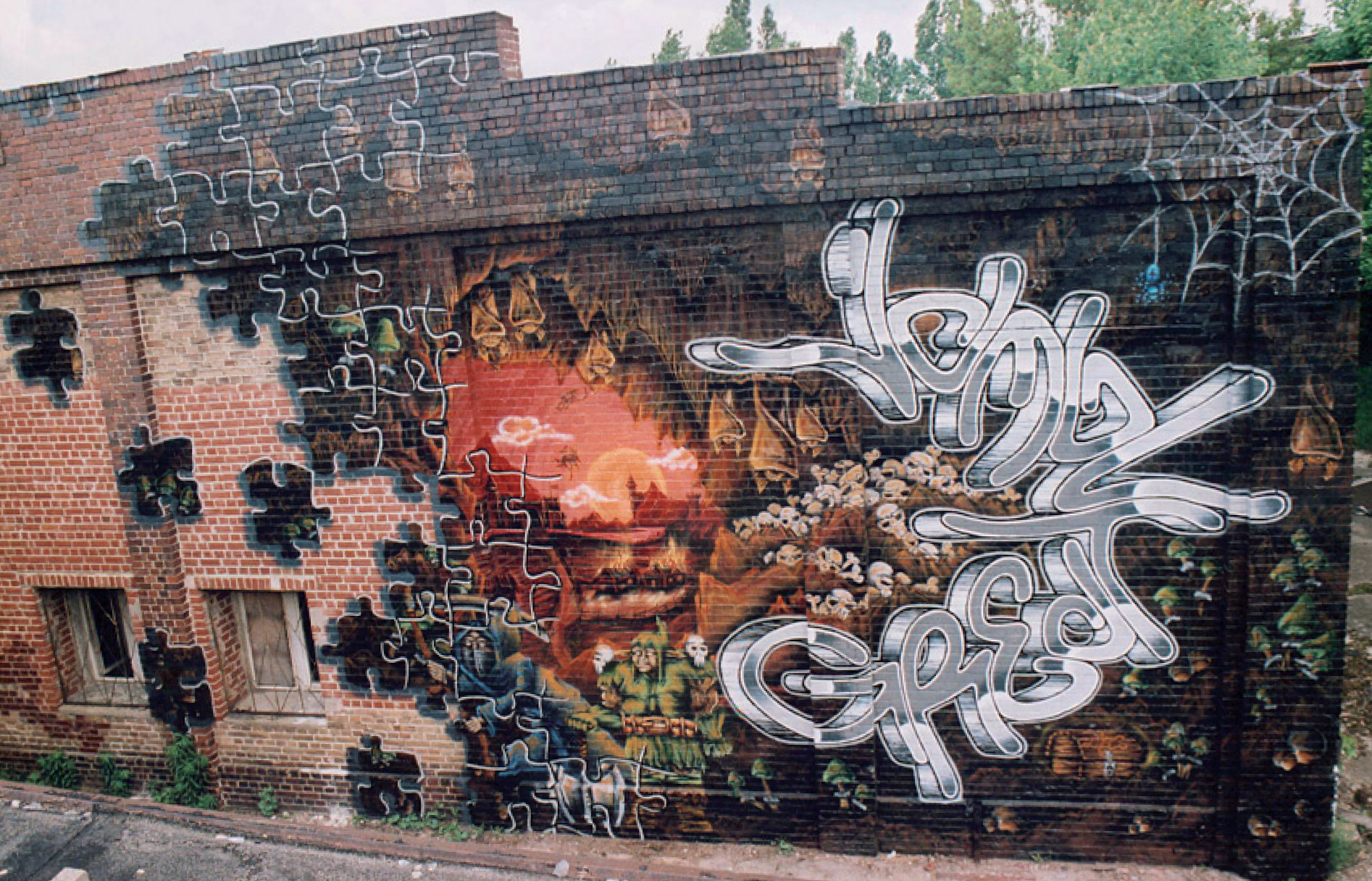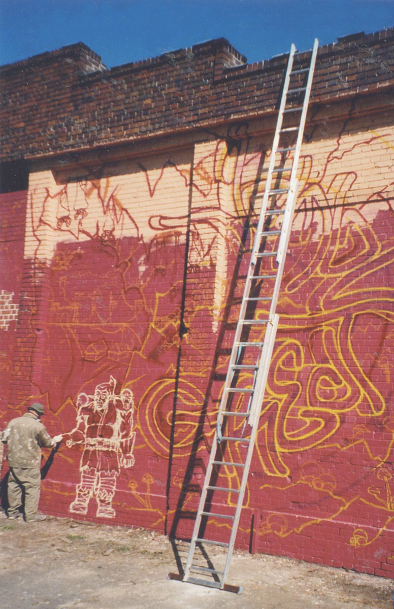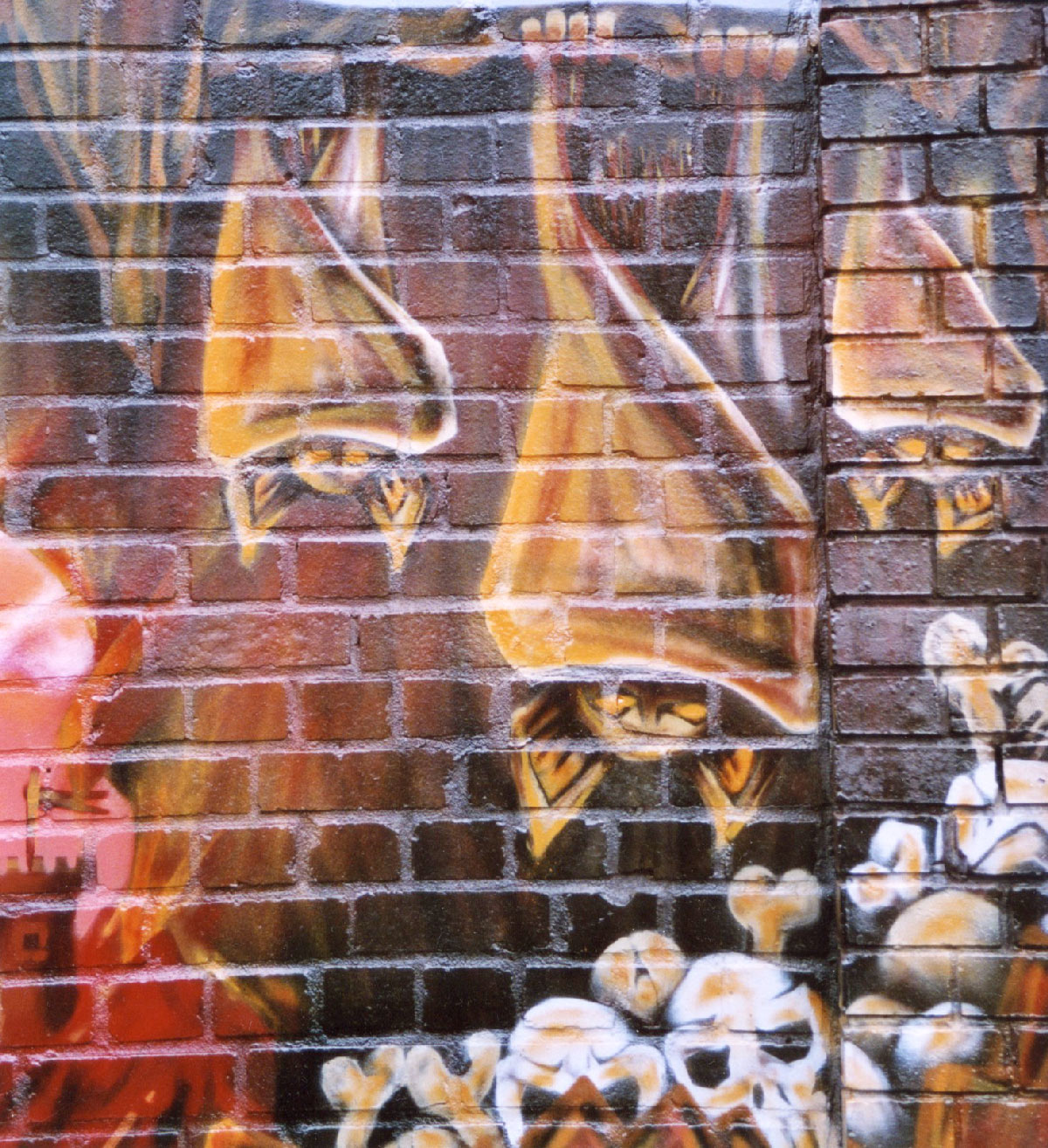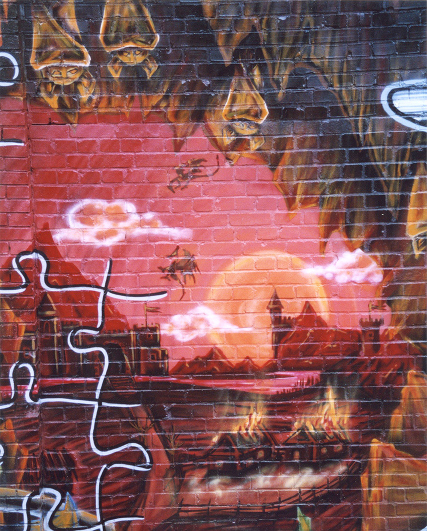 The mural describes a street artist's approach to life. The city is his kingdom where he reigns with paint and tells his visions through his paintings.