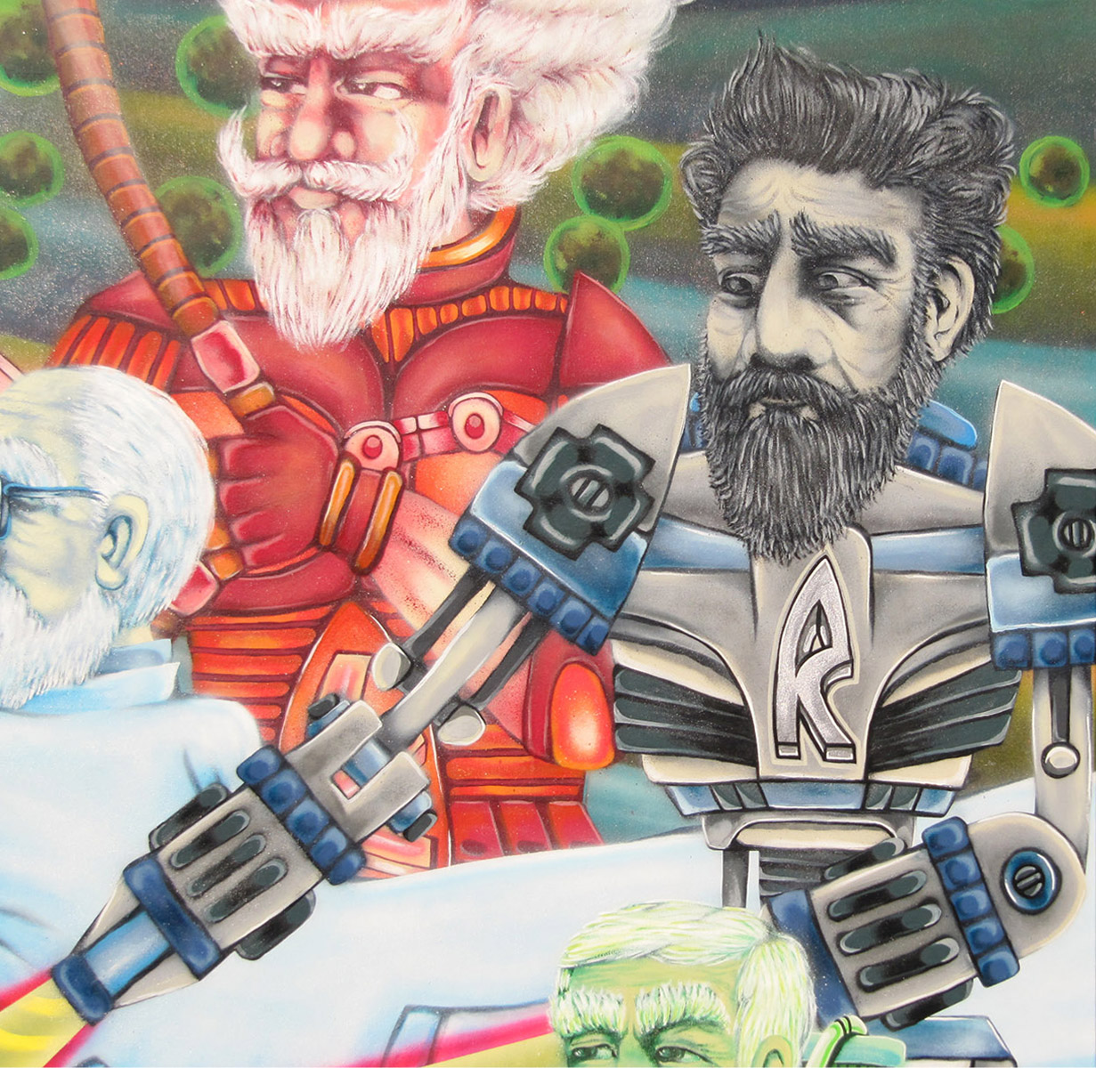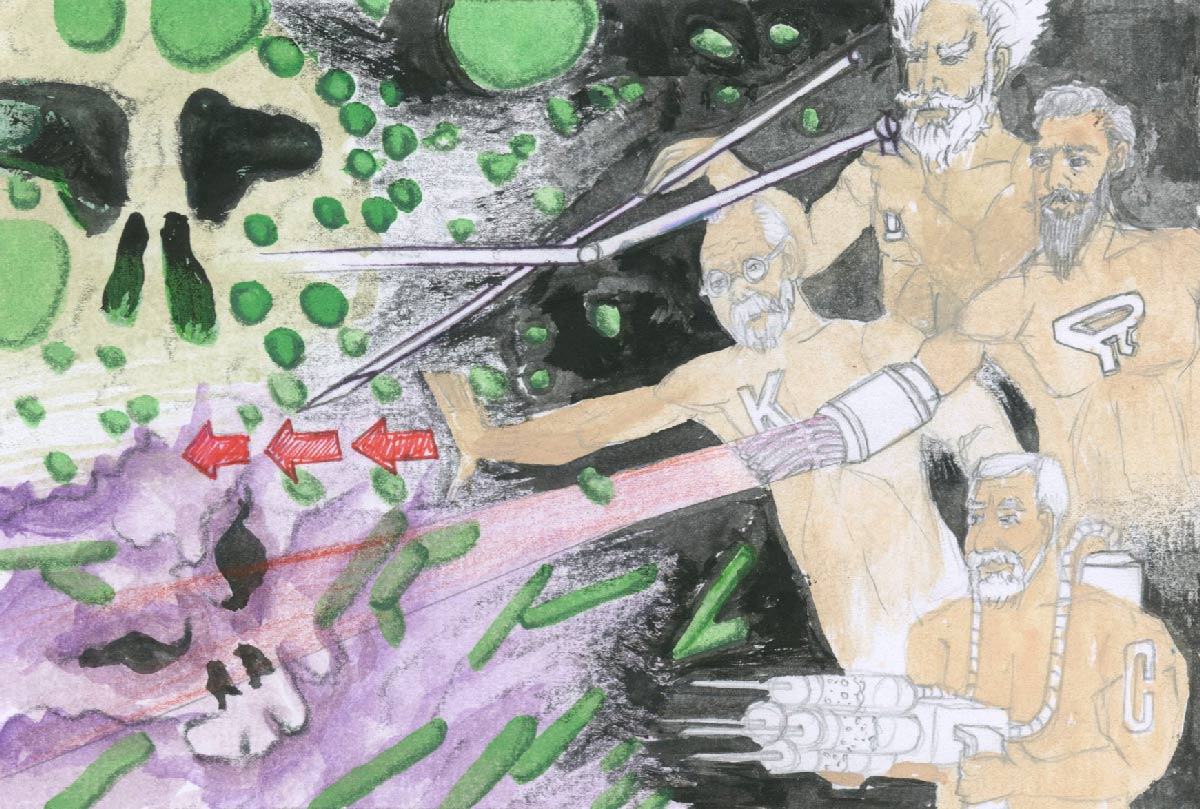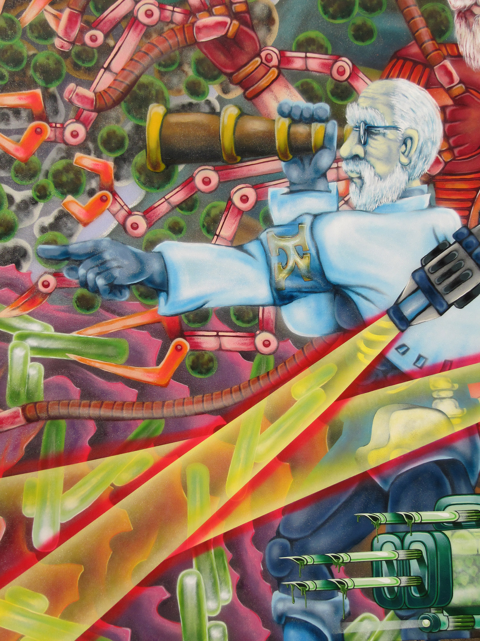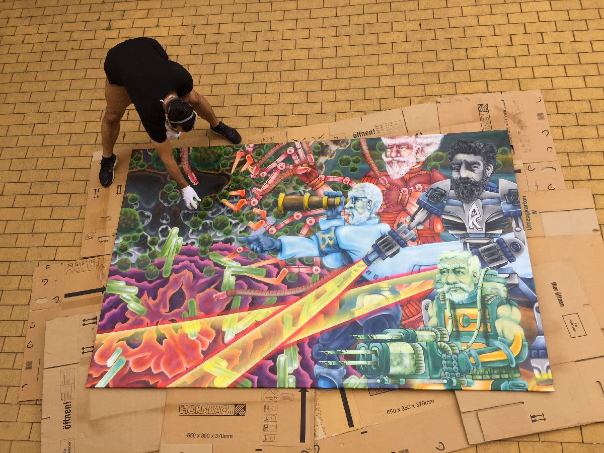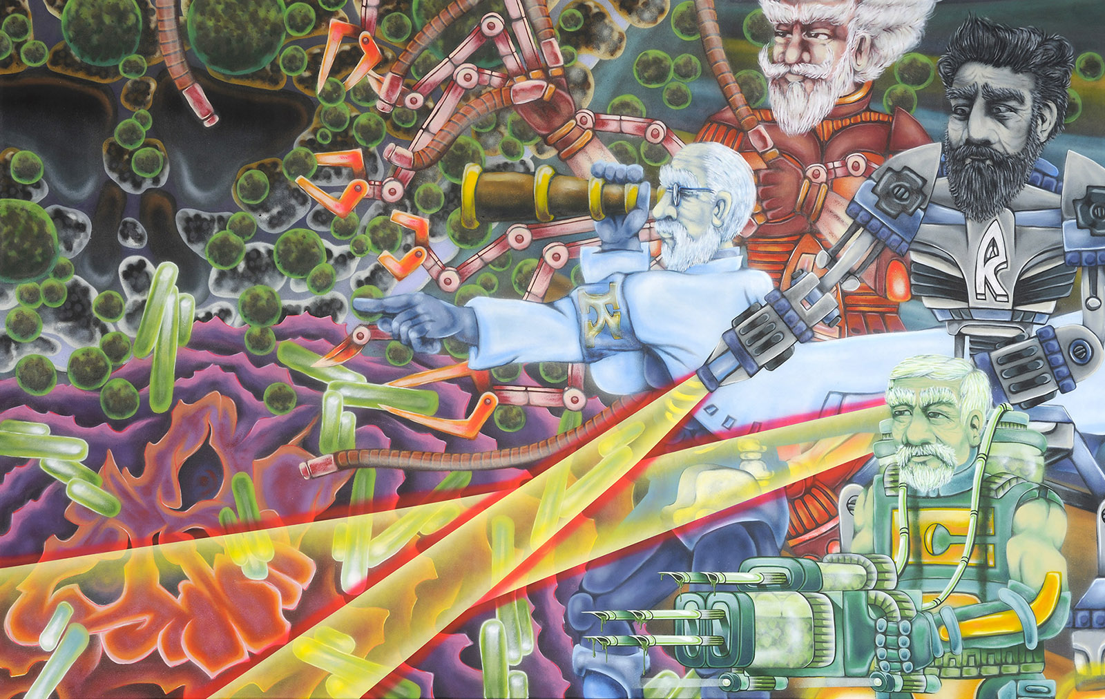 The work shows Robert Koch, Conrad Röntgen, Gustav Kilian and Albert Calmette. These four doctors developed pivotal measures to combat tuberculosis. For this reason they are represented with the attributes of superheros. The composition is loosely based on battle paintings from the Baroque period, combined with modern comic style.
