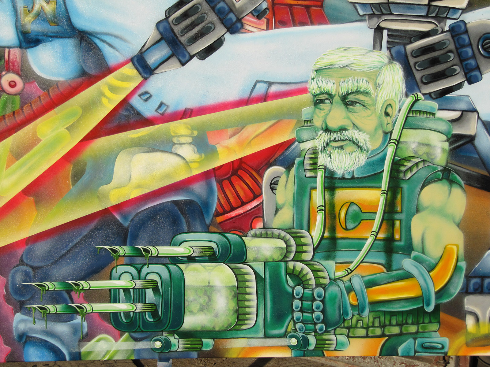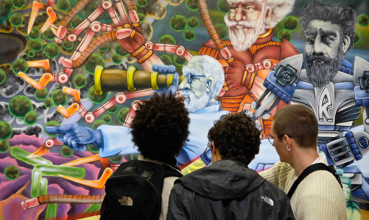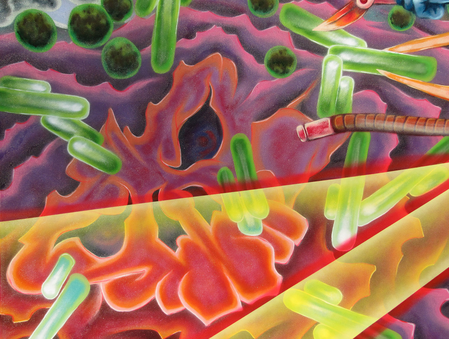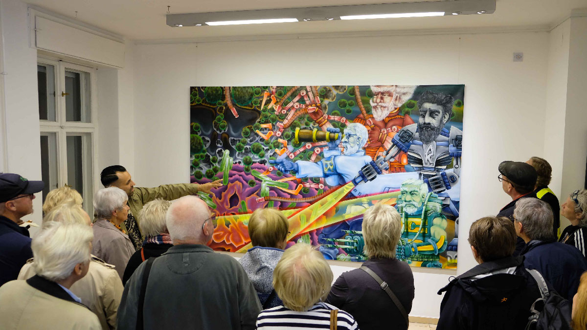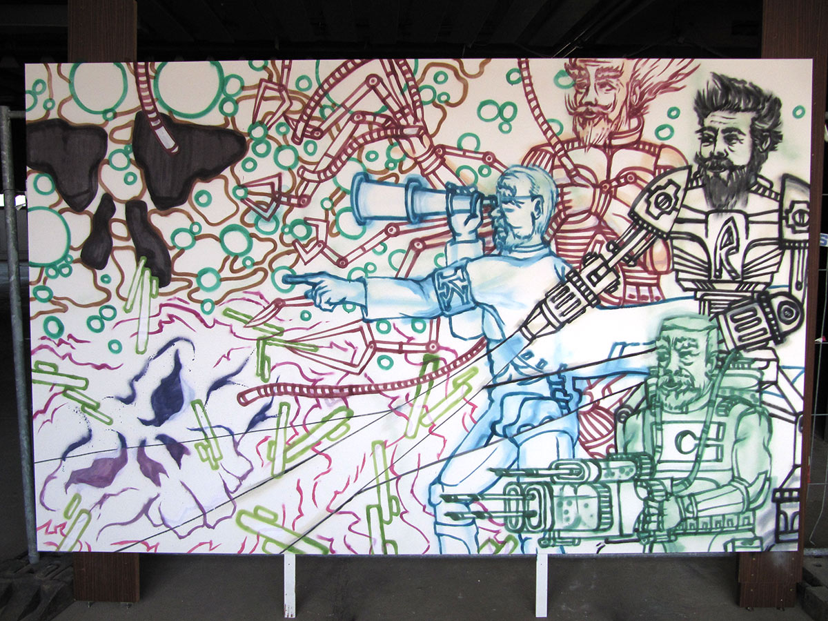 The work shows Robert Koch, Conrad Röntgen, Gustav Kilian and Albert Calmette. These four doctors developed pivotal measures to combat tuberculosis. For this reason they are represented with the attributes of superheros. The composition is loosely based on battle paintings from the Baroque period, combined with modern comic style.