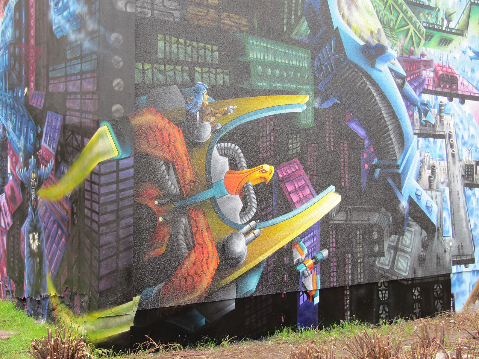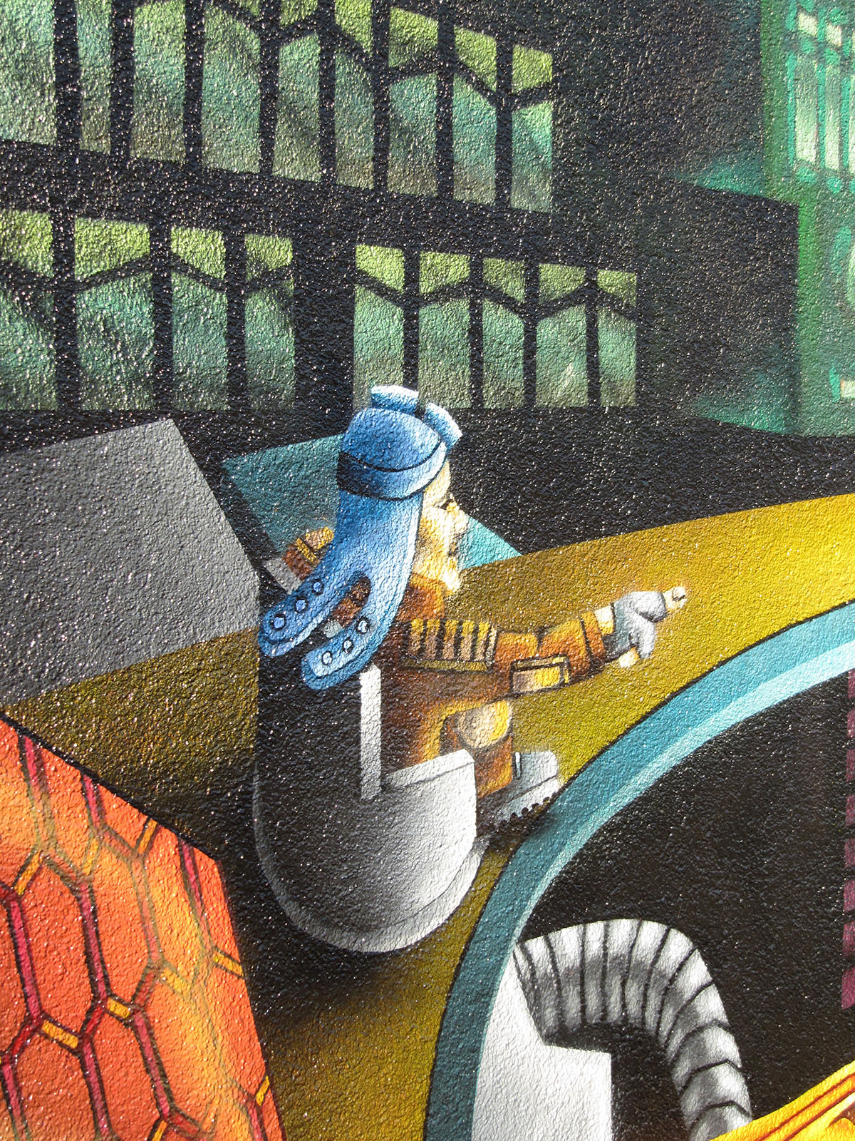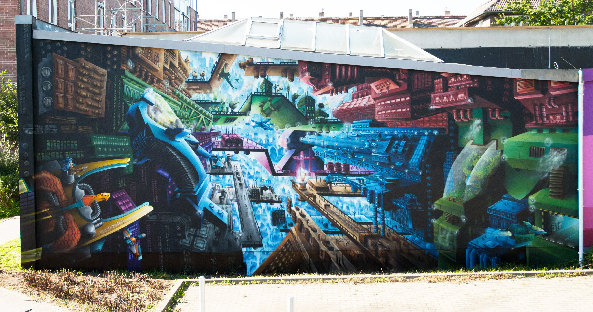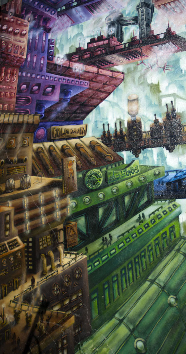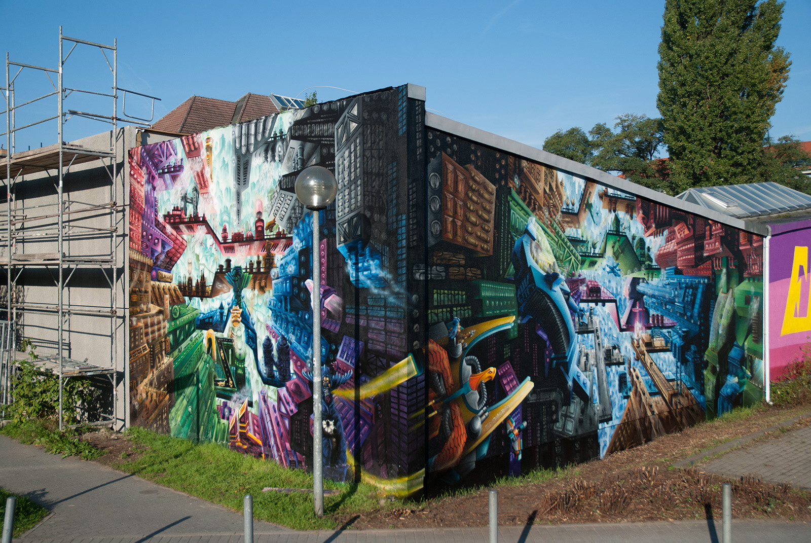 The aim of the wall concept was to dissolve the composition of graffiti, from text in the center, the figure as a supplement and a fitting background. In this mural these elements converge into an inseparable single work in its entirety.