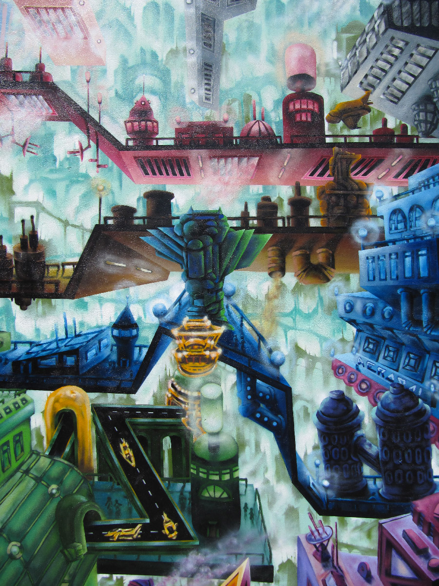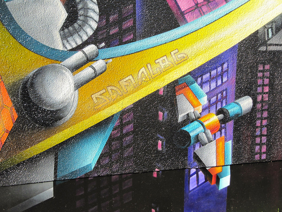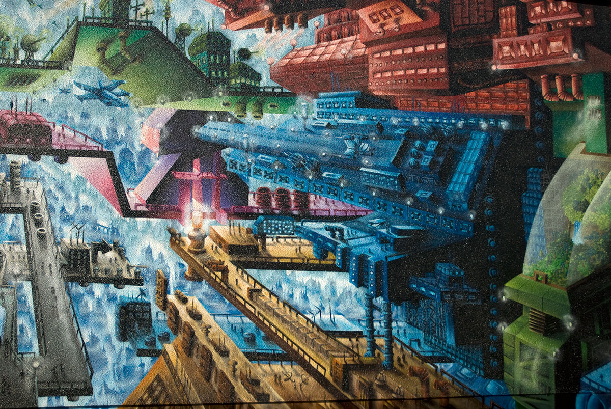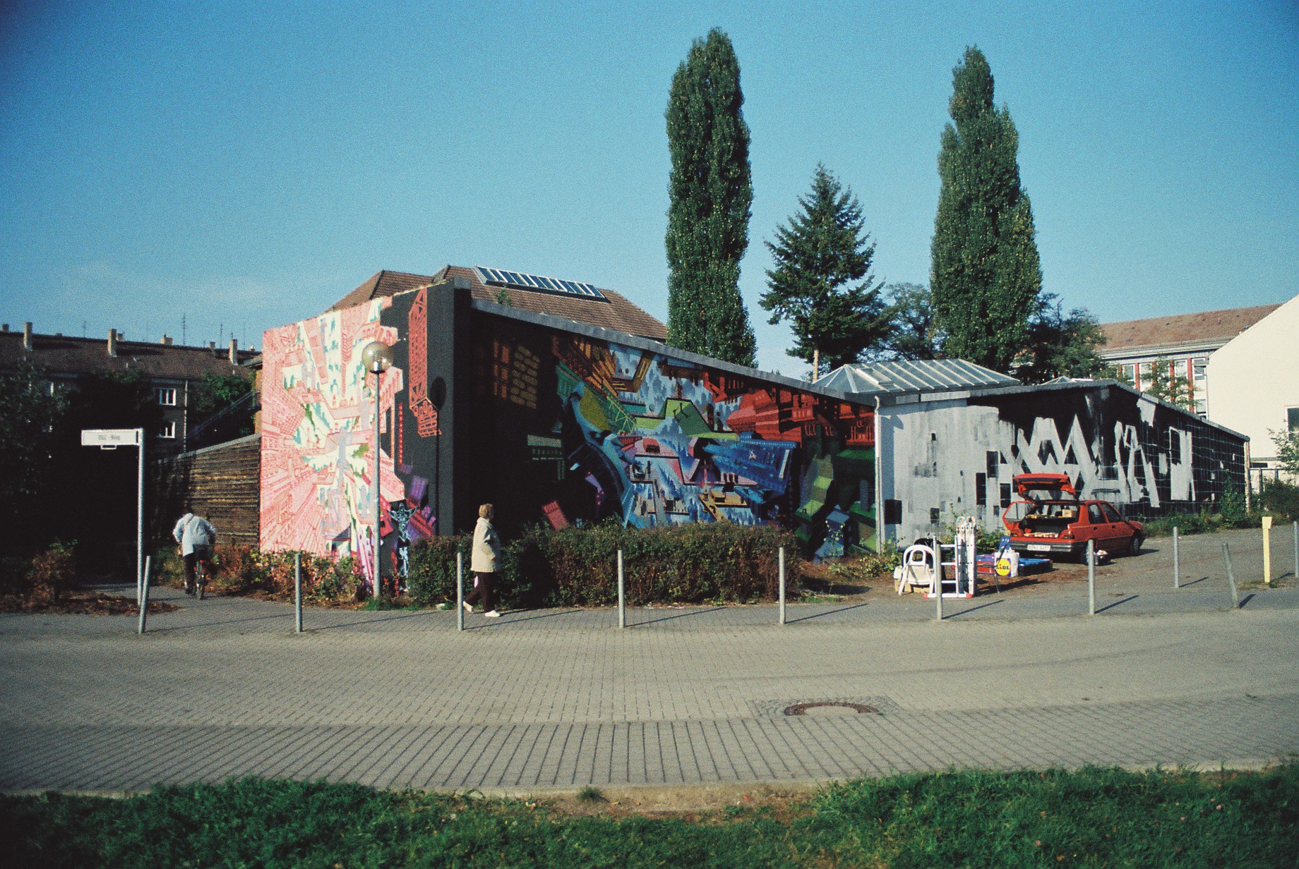 The aim of the wall concept was to dissolve the composition of graffiti, from text in the center, the figure as a supplement and a fitting background. In this mural these elements converge into an inseparable single work in its entirety.